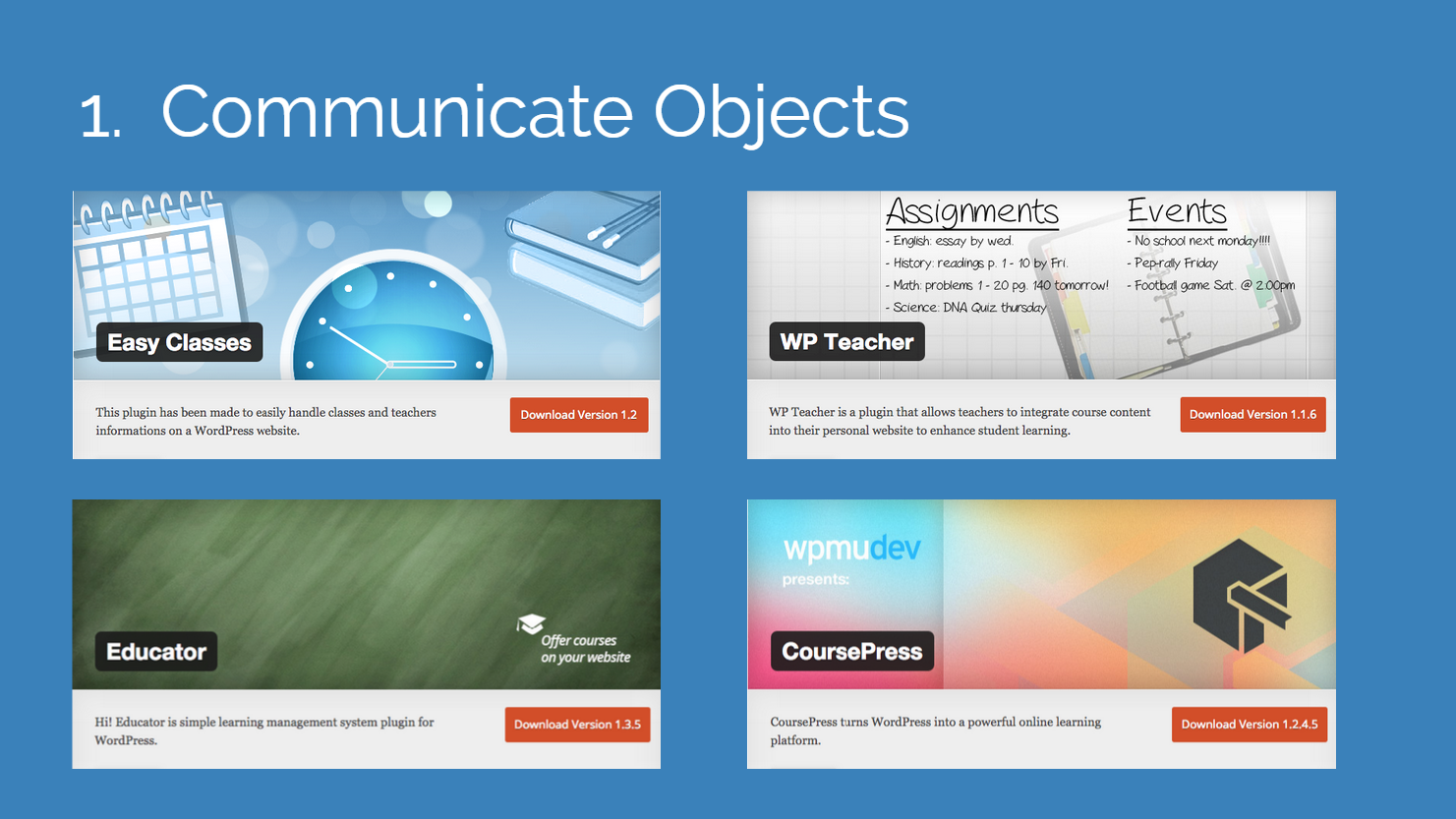 - Communicate objects (syllabus, course objectives, handouts, etc)