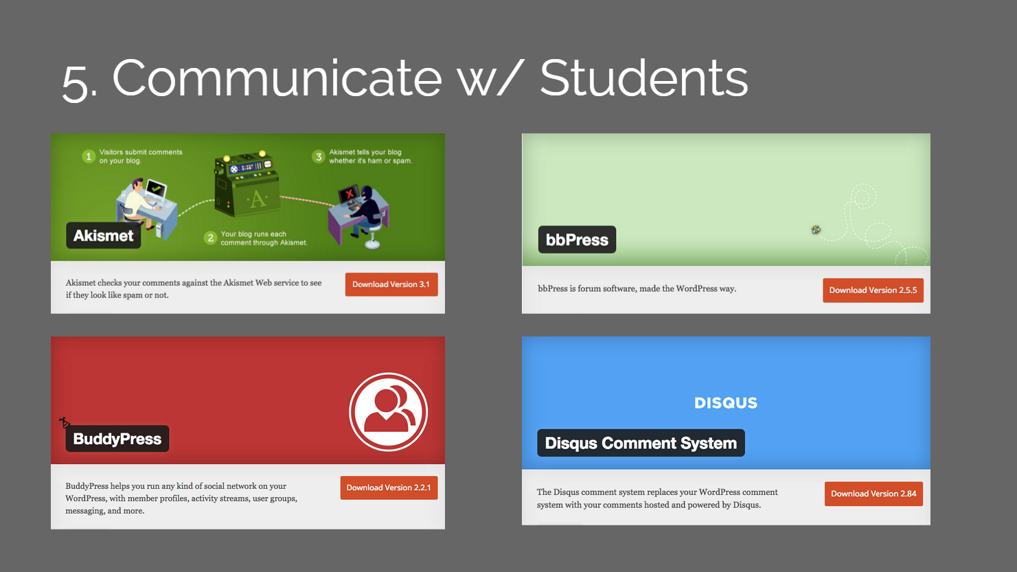 The above 5 functions are available both on WordPress.com and with the WordPress.org software. However, if you REALLY want to power-up your LMS, going self-hosted and installing your own plugins is the best way to go.