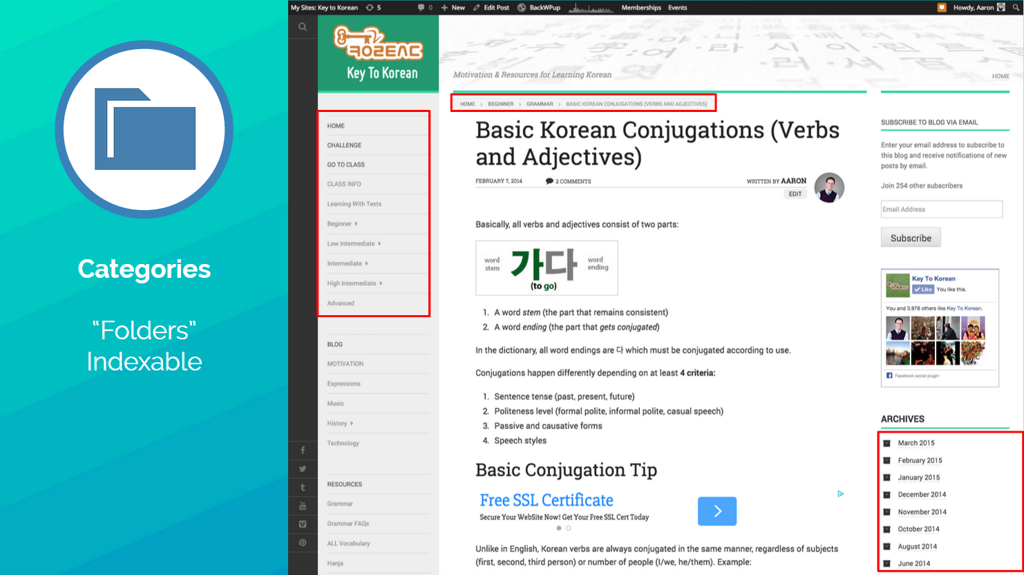 Posts are grouped together by Categories (that act like “buckets” or Folders), and Tags (keywords that are used to Search the site).