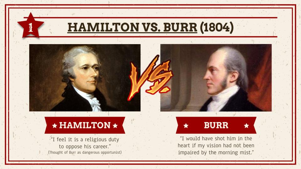 In 1804, he was dropped from the Presidential ticket with Jefferson because of his behavior in 1800 (and actually, he was frozen out of any influence in the 1800 Jeffersonian administration as well). He then attempted to revive his political career by (unsuccessfully) becoming governor of New York. Burr heard reports that Hamilton had privately slandered him before the election, and that was the last straw. The duel was on. This whole story sure gives a new level of depth to their rivalry.