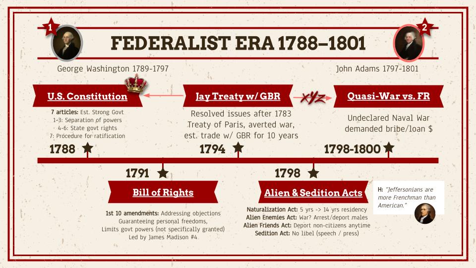After ratifying the U.S. Constitution, the Federalist-dominated Congress (Hamilton’s party) passed a series of 4 Acts, known as the Alien & Sedition Acts. The Federalists argued these would strengthen national security during the Quasi-War with France. Critics argued they were an attempt to suppress non-Federalist votes and violated the freedom of speech in the First Amendment of the Constitution.