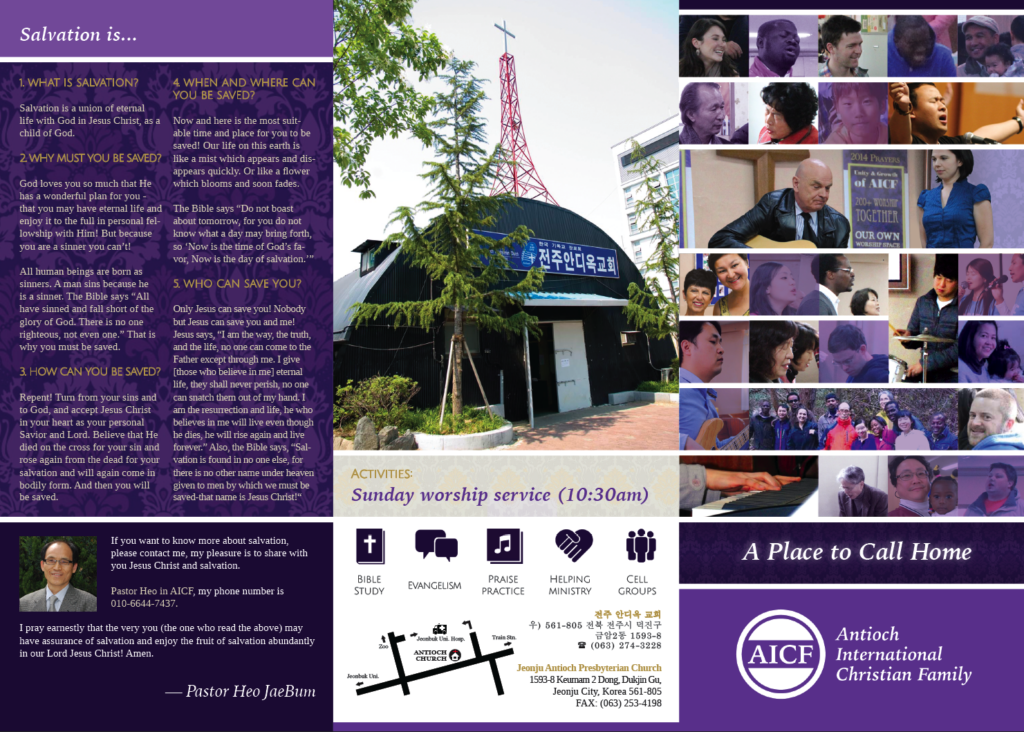 In early 2014, the AICF church pastors asked me to update our church information pamphlet as a tri-fold brochure that could be printed on an A4 paper. After visiting the print shop and confirming the measurements, I set to work. Since we were right in the middle of the Matthew series at that time, I used the same design elements and colors from the Matthew sermon art to influence the design of this brochure.
