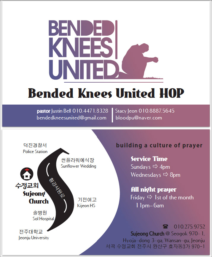 After working on the Sujeong English Service business cards, the pastor requested that I also create some cards with his other logo. Unfortunately, these never went to print as the church decided to go in another branding direction (the Jeonju House of Prayer), but here are the designs anyway.