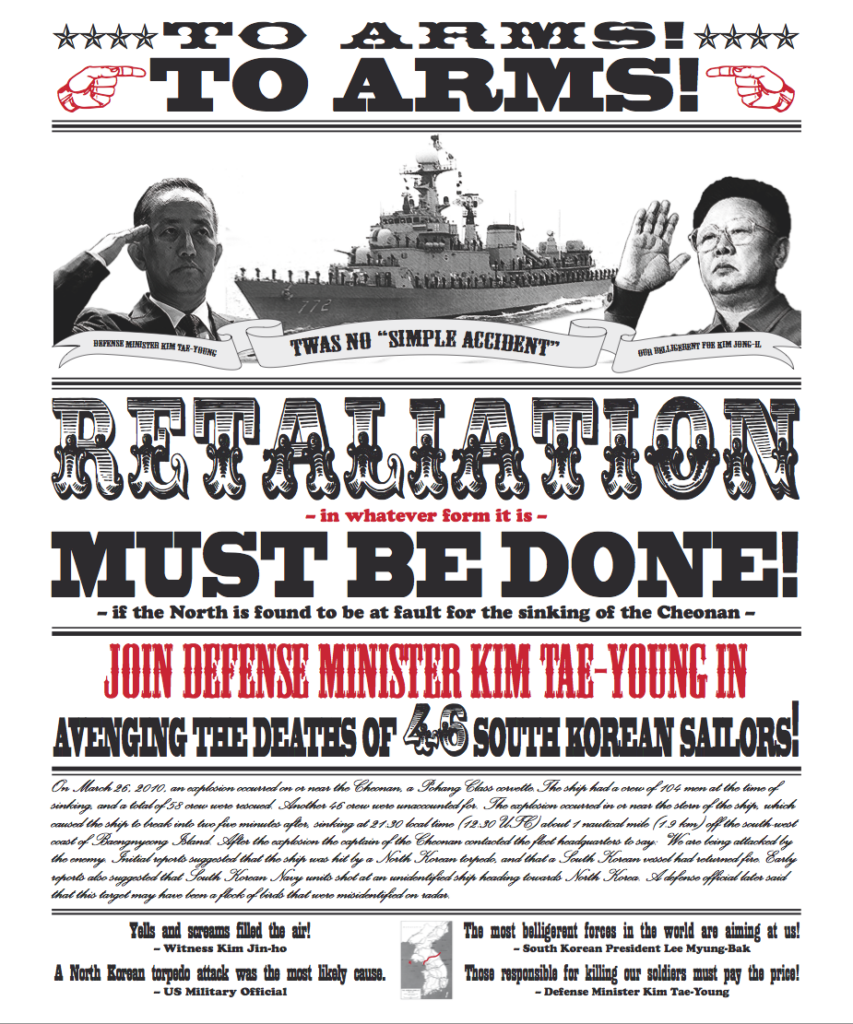 By far one of my favorite designs I made in grad school was in the first week of school. The teacher assigned us the task to create a poster in some kind of “period style.” I chose Civil War style posters to create “A Modern Civil War Poster for South Korea’s Cheonan Warship Sinking.” (The preceding link includes my thought process, research notes, and research paper for the design.)