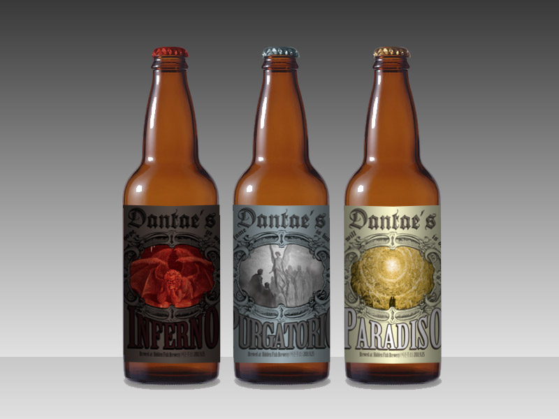 One of my coworkers in 2011 is a home brewer (Hidden Fish Brewhouse). She challenged me to create some beer labels for a batch they were making for her friends’ engagement. The friends’ names were Dan and Tae, thus the combination creates a misspelled play on the name of the famous Dante who wrote The Divine Comedy.