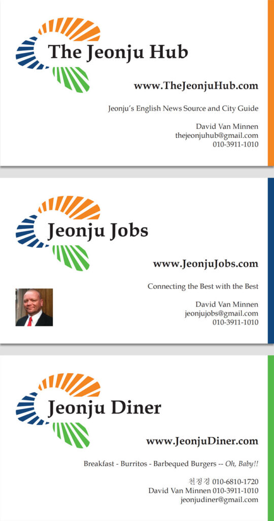 In 2011, the owner of The Jeonju Hub was just getting started working on a new venture, the Jeonju Diner, and asked for three business card designs that included his recruiting business (Jeonju Jobs).